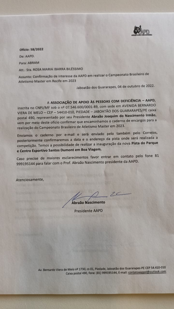 A Associação de Apoio as Pessoas com Deficiência-AAPD, encaminhou ofício e o caderno de encargos ratificando interesse em realizar o Campeonato Brasileiro de Atletismo Master em 2023 em Recife.